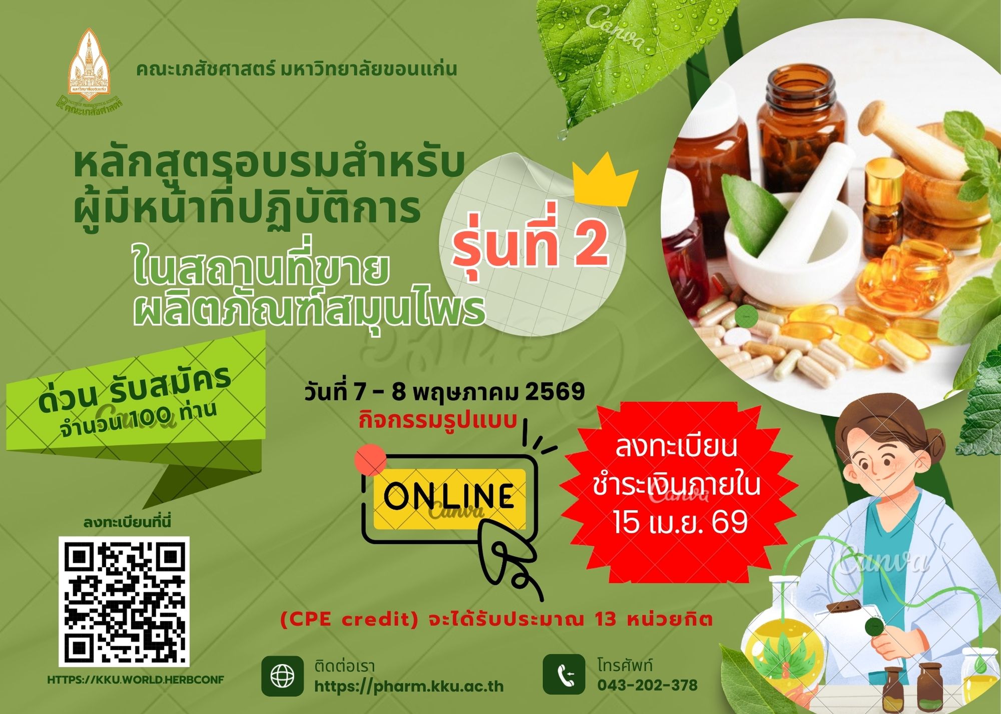โครงการฝึกอบรม “หลักสูตรอบรมสำหรับผู้มีหน้าที่ปฏิบัติการในสถานที่ขายผลิตภัณฑ์สมุนไพร” รุ่นที่ 2 (ฝึกอบรมแบบ Online) (รับจำนวนจำกัด 100 คน ถึงวันที่ 15 เมษายน 2569)