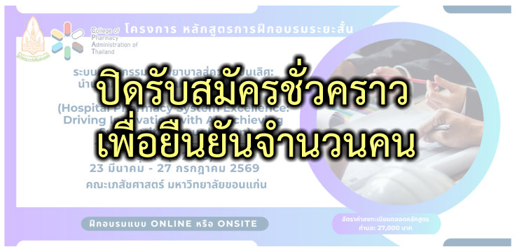 โครงการ หลักสูตรการฝึกอบรมระยะสั้น (4 เดือน) ระบบเภสัชกรรมโรงพยาบาลสู่ความเป็นเลิศ: นำนวัตกรรมด้วย AI เหนือกว่าด้วย Lean (Hospital Pharmacy System Excellence: Driving Innovation with AI, Achieving Superiority through Lean) รุ่นที่ 1 (ปี 2569) รูปแบบ Online และ/หรือ Onsite (1 ครั้ง) (รับจำนวนจำกัด 15 คน ถึงวันที่ 31 มกราคม 2569)